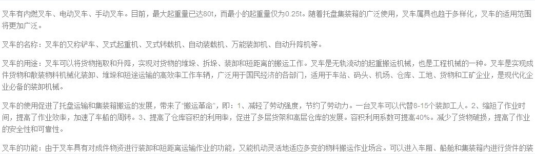 卸搬運作業,經濟地滿足各種短途物料搬運車作業的要求。叉車以內燃機或蓄電池與電動機為動力,帶有貨叉承載裝置,具有自行能力,工作裝置可完成升降和前后傾、夾緊、推出等動作,能實現成件物資的裝卸、搬運嗯哼拆碼垛作業。若配備其他屬具,還能用于取大件貨物散裝物資和非包裝物資的裝卸作業以及牽引和吊裝等工作。從而有效地減輕勞動強度,提高生產率,降低經濟成本,增強作業性
